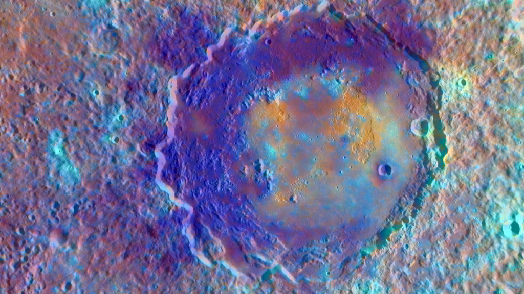 The colors in this image represent different types of geologic material seen in one of Mercury's impact basins.