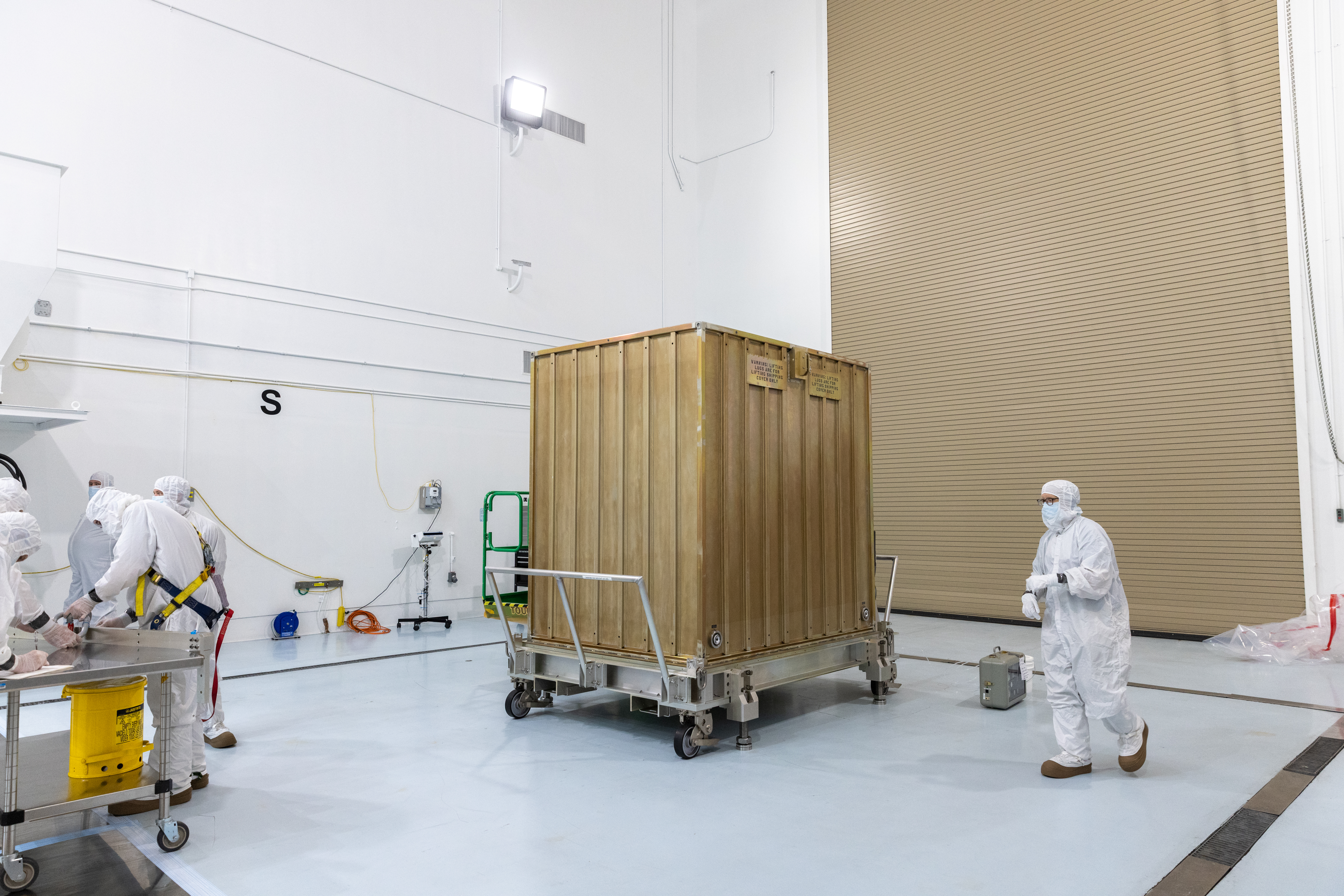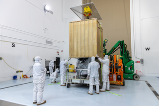 Technicians prepare to remove the protective casing covering NASA’s Carruthers Geocorona Observatory on Monday, July 21, 2025, at the Astrotech Space Operations Facility near the agency’s Kennedy Space Center in Florida.