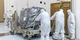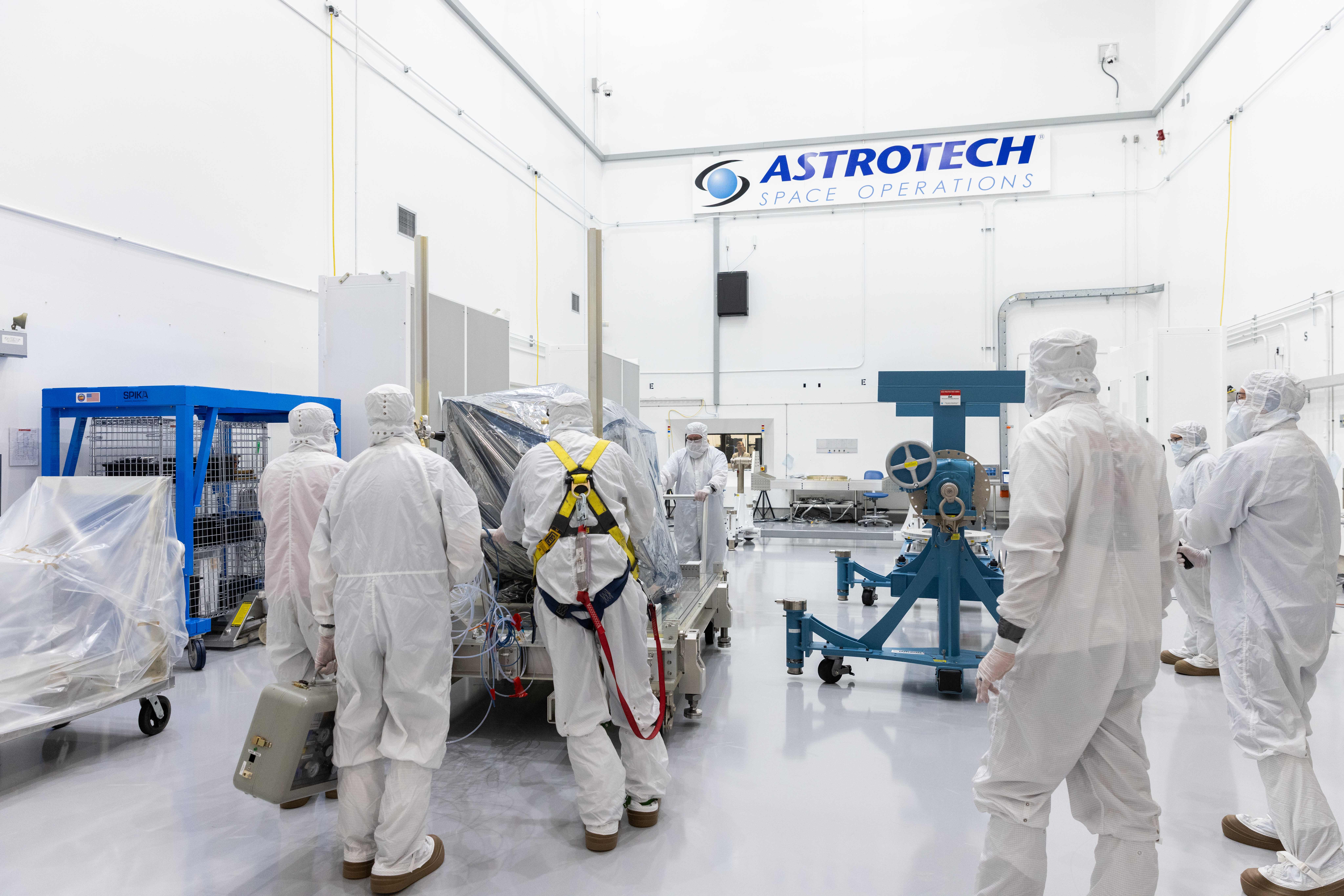 Technicians remove the protective casing covering NASA’s Carruthers Geocorona Observatory on Monday, July 21, 2025, at the Astrotech Space Operations Facility near the agency’s Kennedy Space Center in Florida.