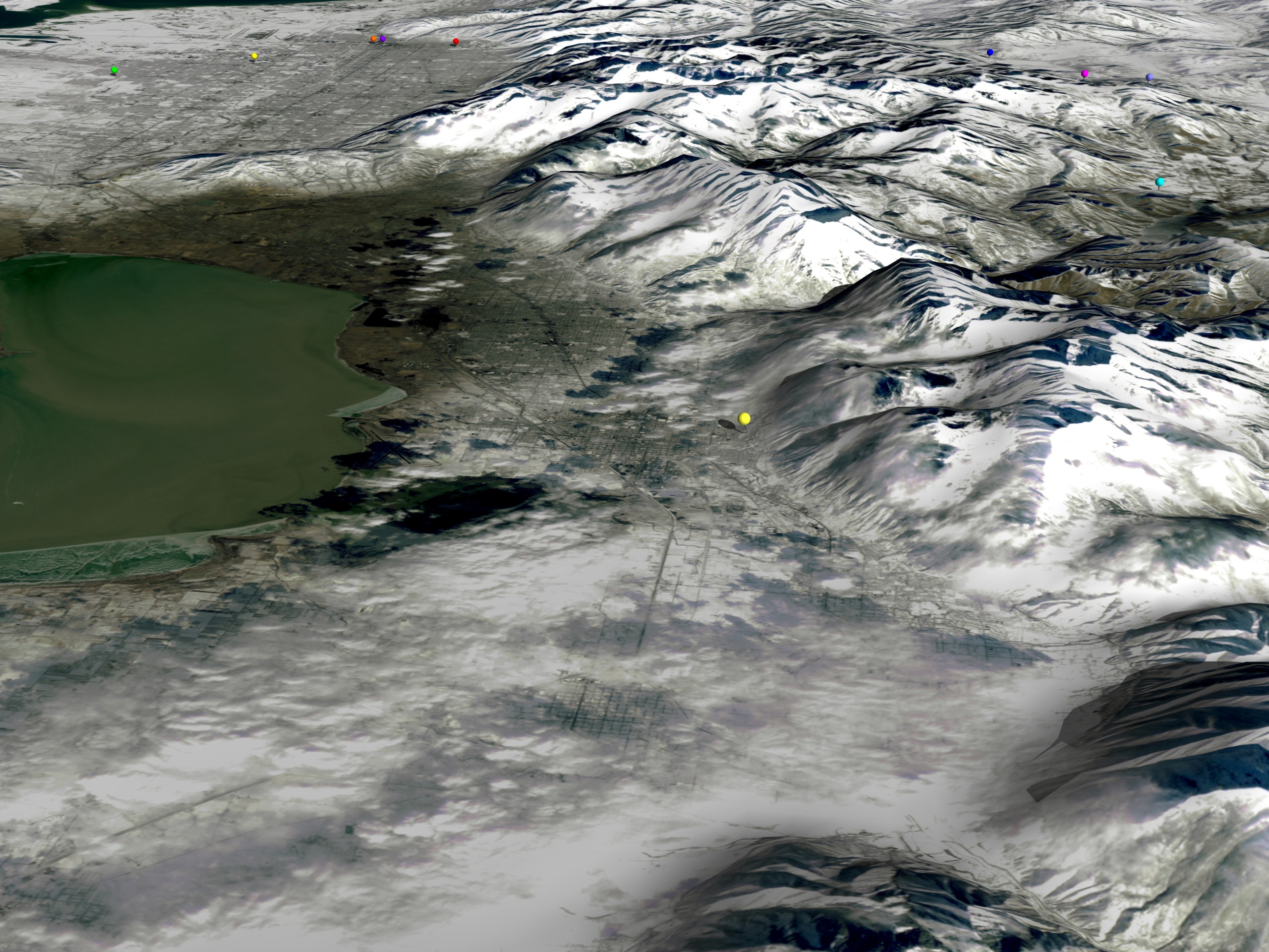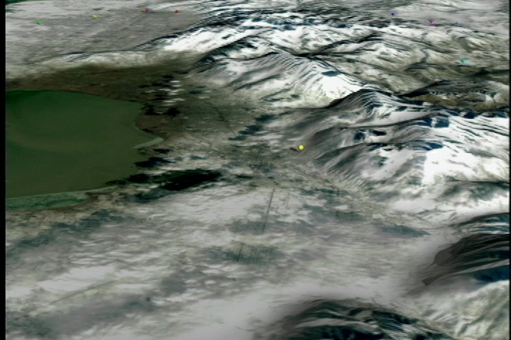 An animated flyover of the Salt Lake City region. Pushpins highlight the Winter 2002 Olympic venues.
