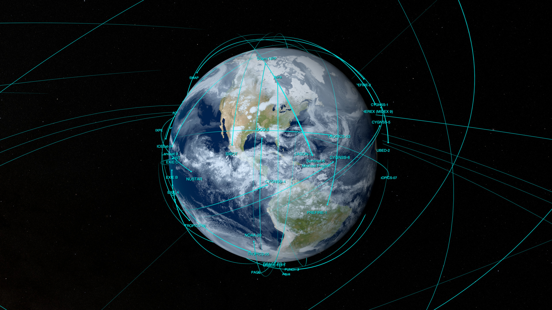 These visualizations show the orbits of NASA satellites considered operational as of July 2025. They include both NASA-managed missions and NASA-ESA joint missions. Scroll to the bottom of the page for a full list of satellites included in these visualizations.
