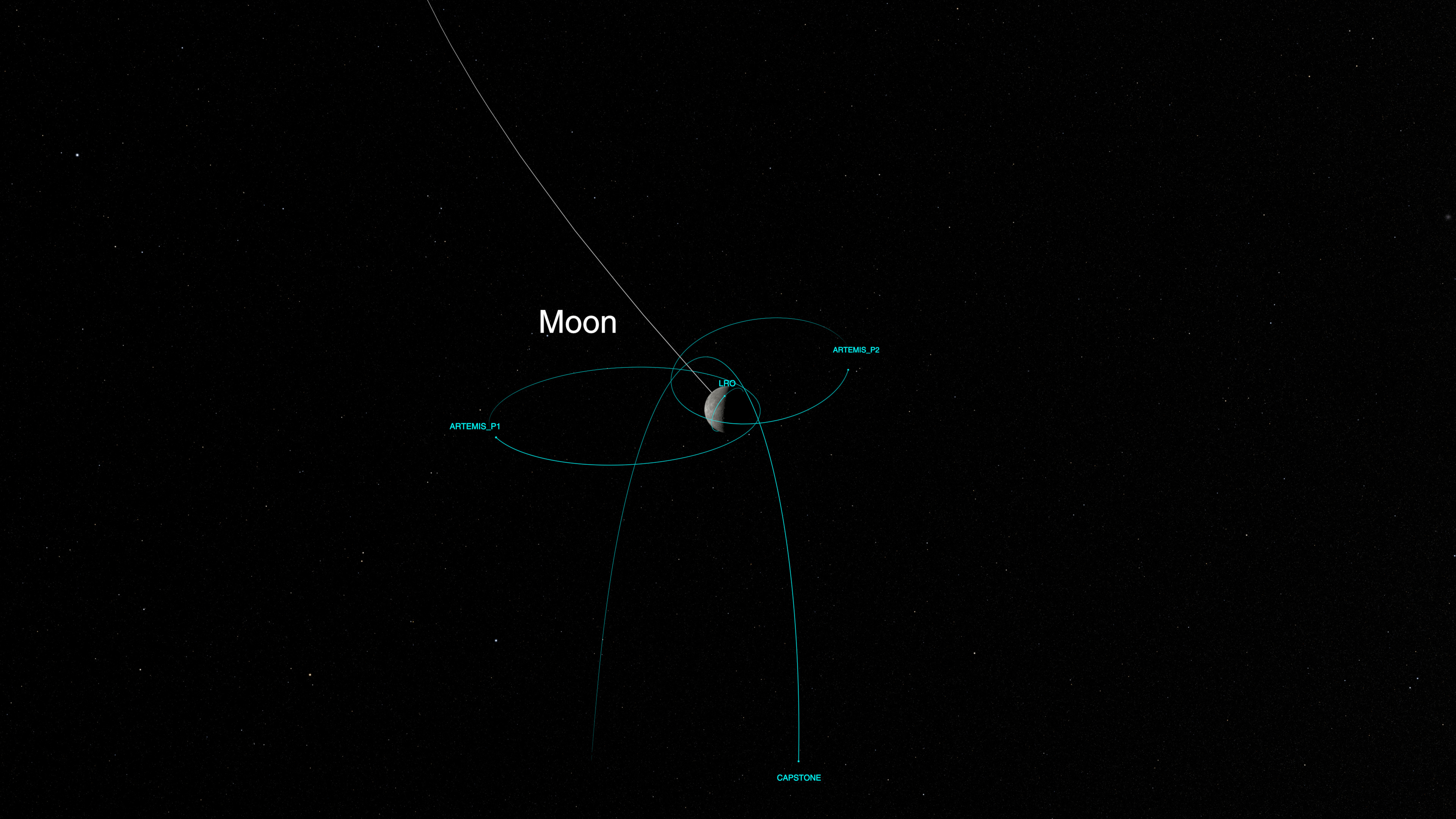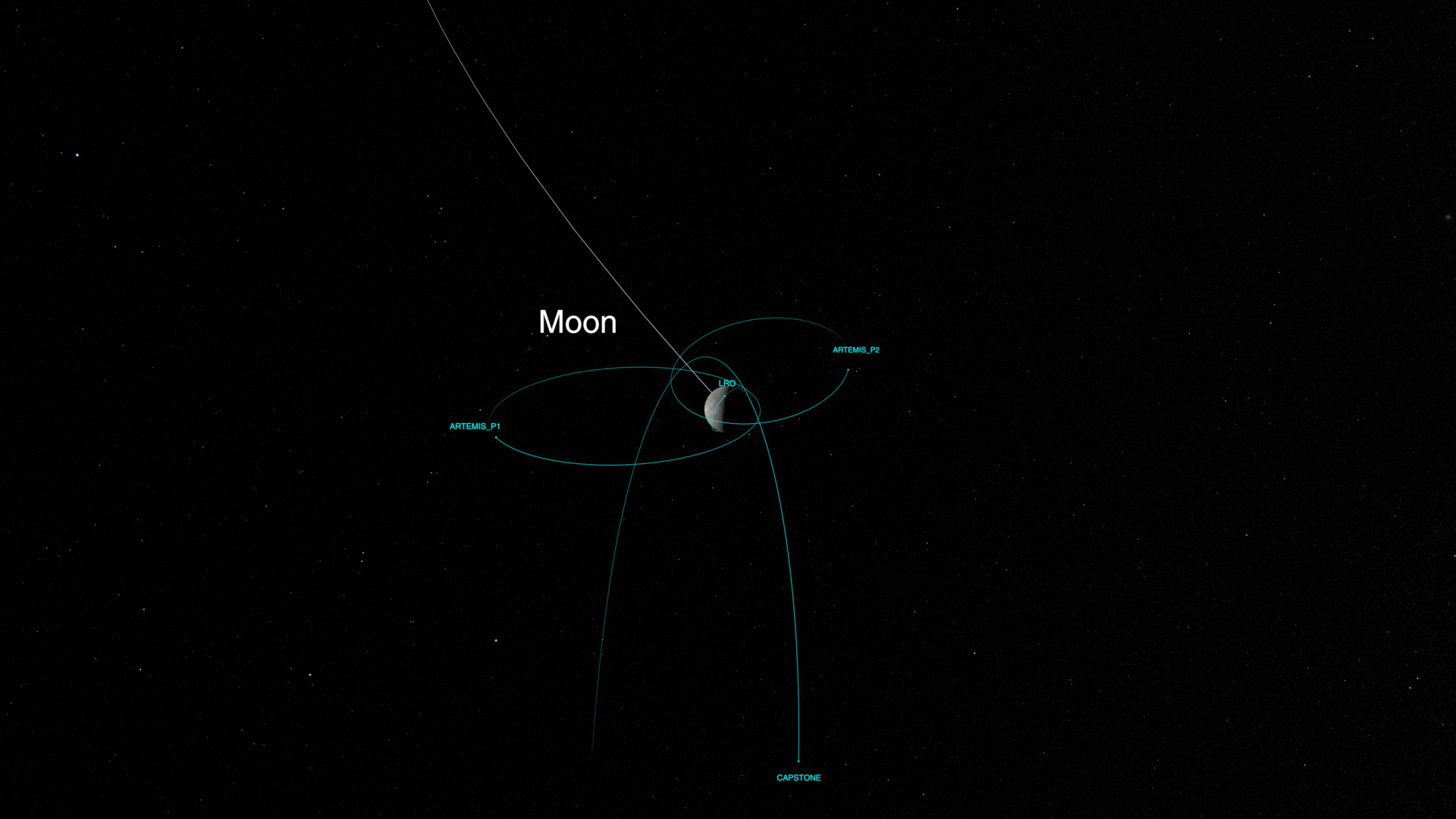 Still image – View of the Moon, with the LRO, Artemis P1/P2, and CAPSTONE satellites.