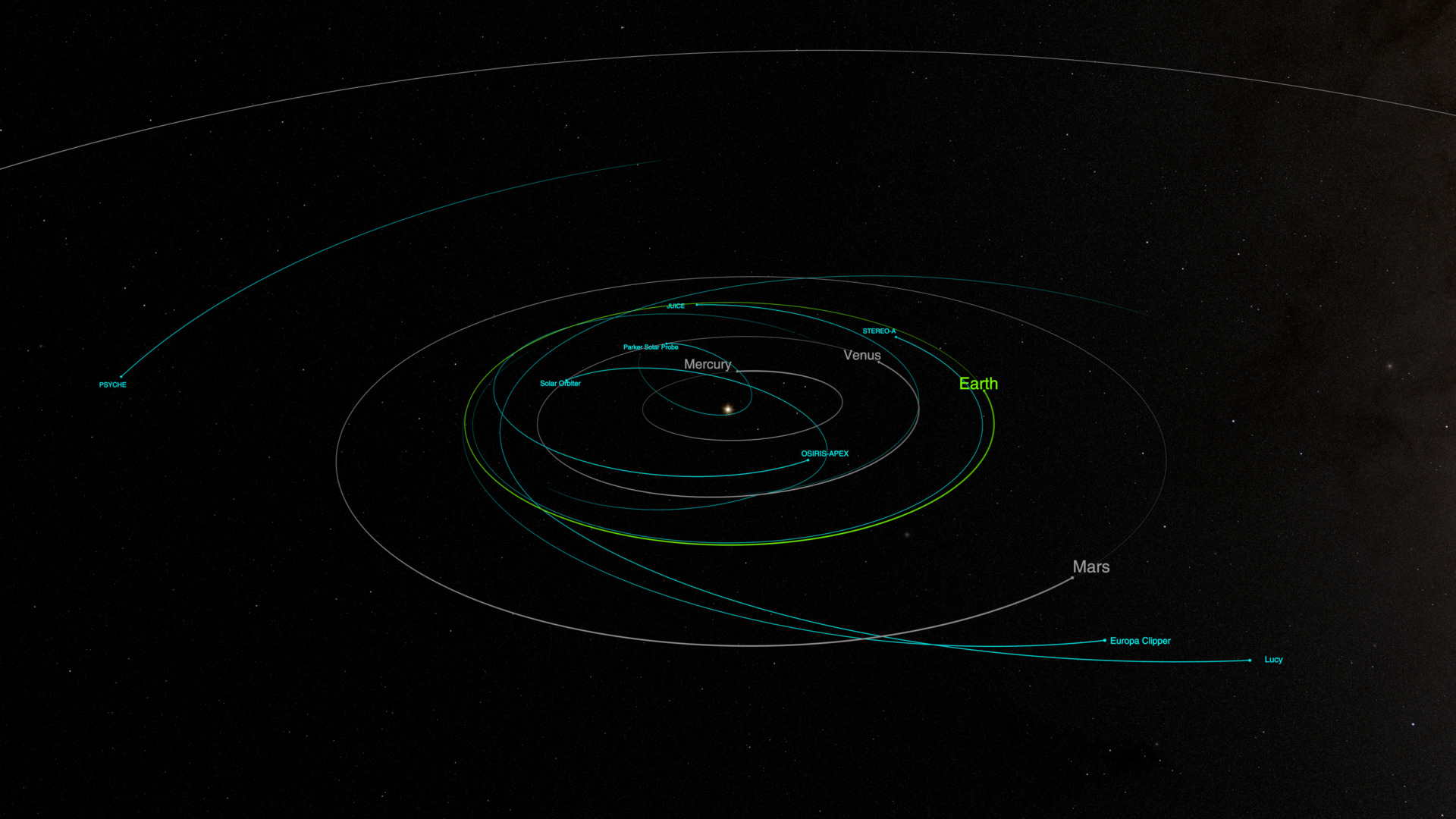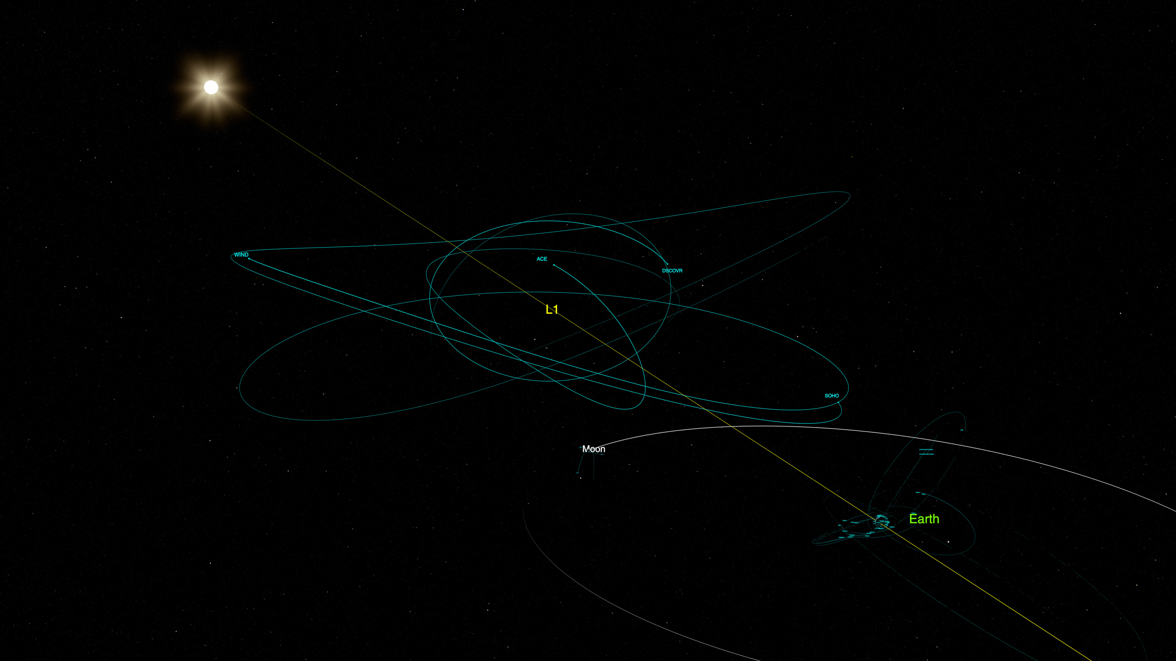 This visualization is a tour of the Solar System, showing all of NASA’s active satellites as of July 2025. It begins near Earth, highlighting satellites in orbit around the planet. The camera then pulls back to reveal satellites at the Moon, L1, and L2. A thin yellow line indicates the direction of the Sun, showing the spatial relationship between the Sun, Earth, and Lagrange points. The camera then zooms back to Earth.