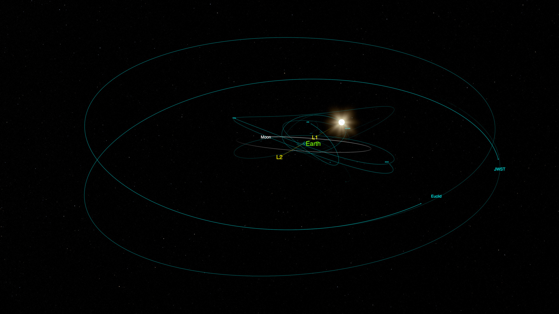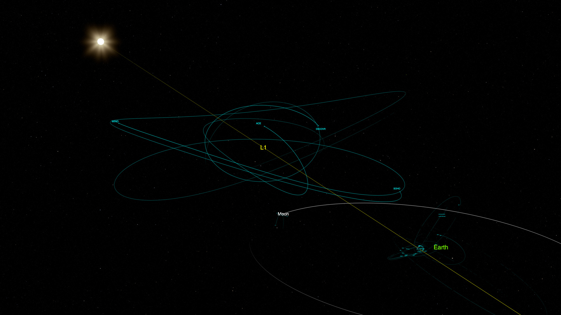 Still image – View of L1 and the satellites orbiting the Lagrange point. Earth, the Sun, and the Moon are also visible.