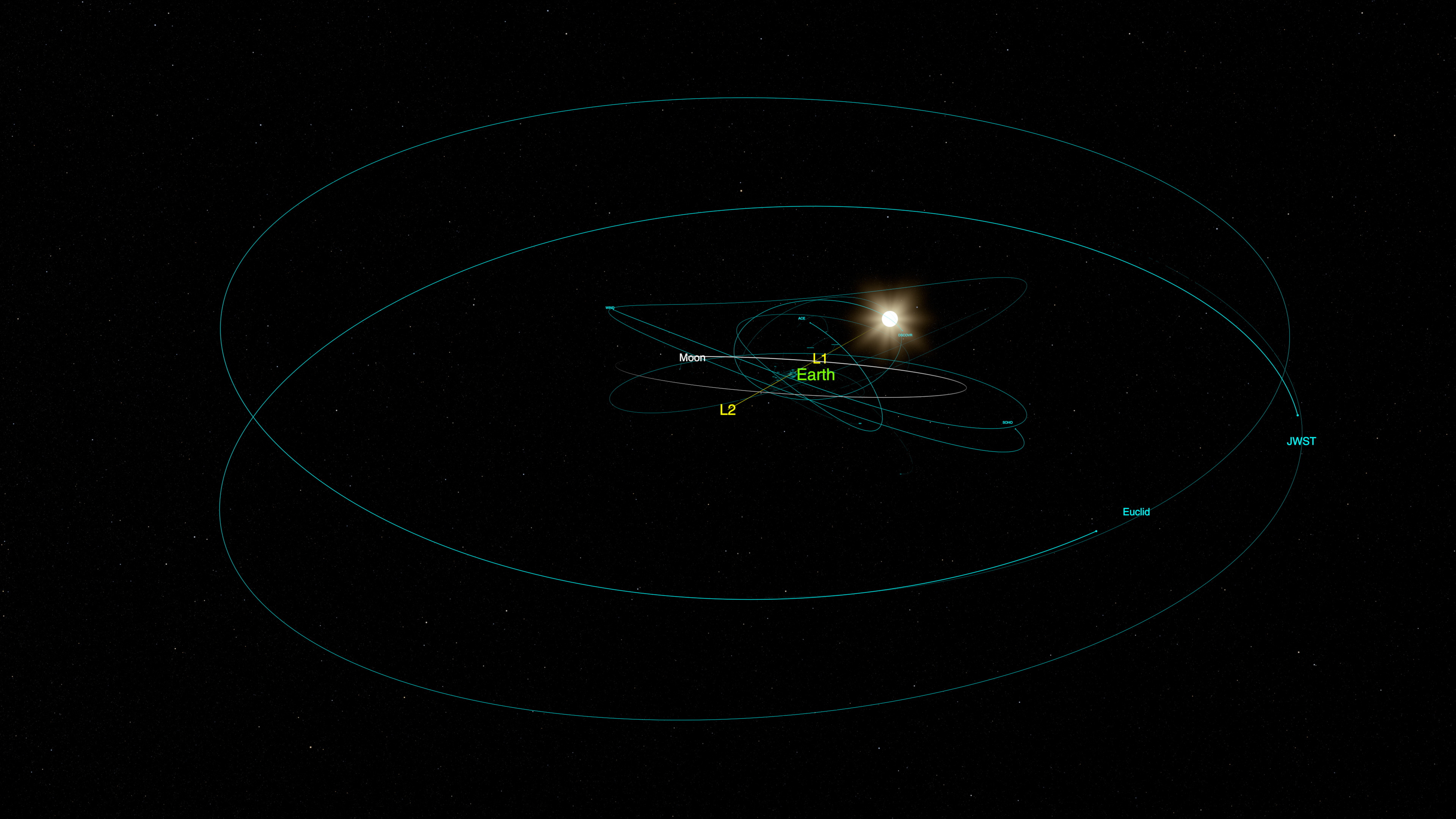 Still image – View of L2 and the satellites orbiting the Lagrange point. Earth, the Sun, and the Moon are also visible.