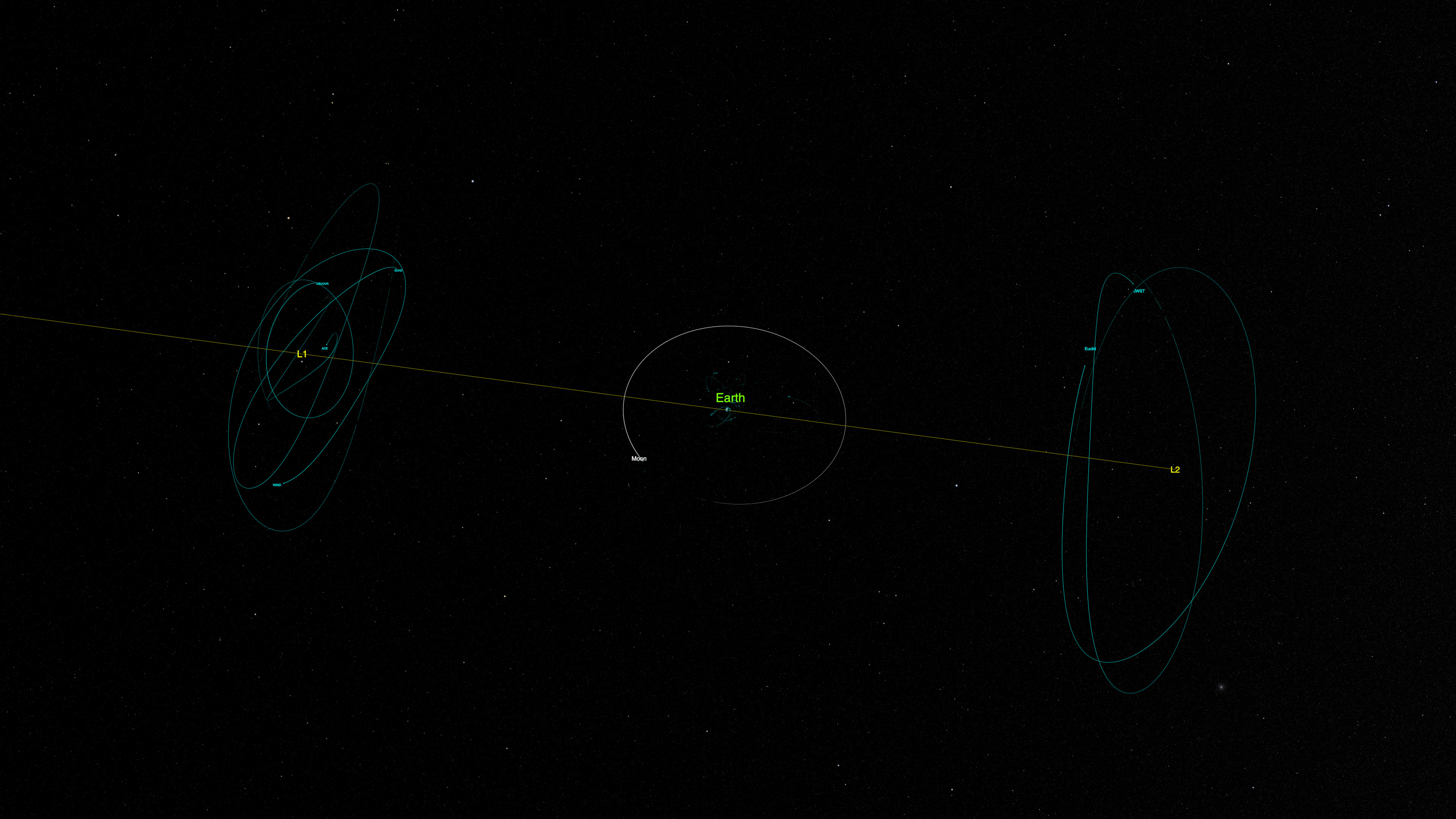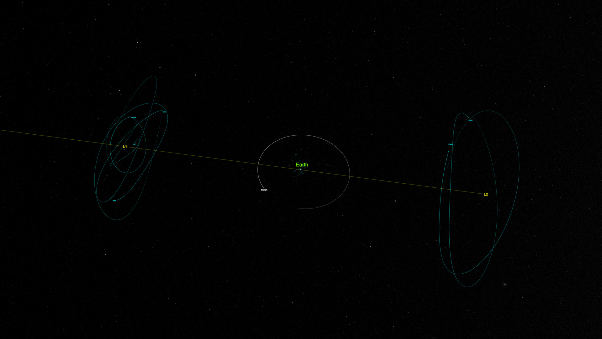 Still image – Top-down view of Earth, the Moon, L1, and L2. A thin yellow line indicates the direction of the Sun, highlighting the spatial relationship between the Sun, Earth, and Lagrange points.