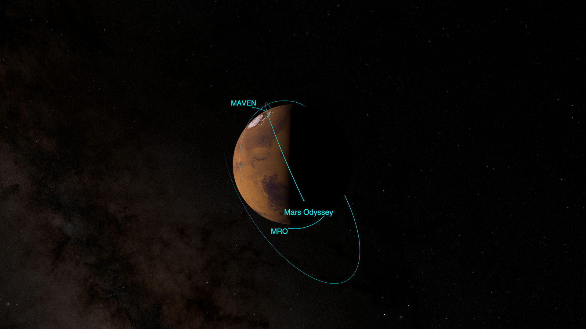 Still image – Close-up view of Mars, showing the MRO, MAVEN, and Mars Odyssey satellites.