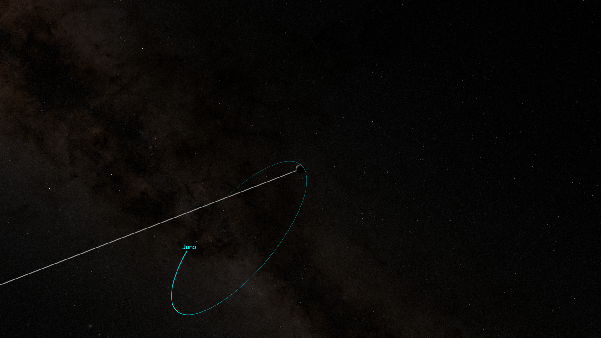 Still image – Medium-distance view of Jupiter and the orbit of the Juno satellite.