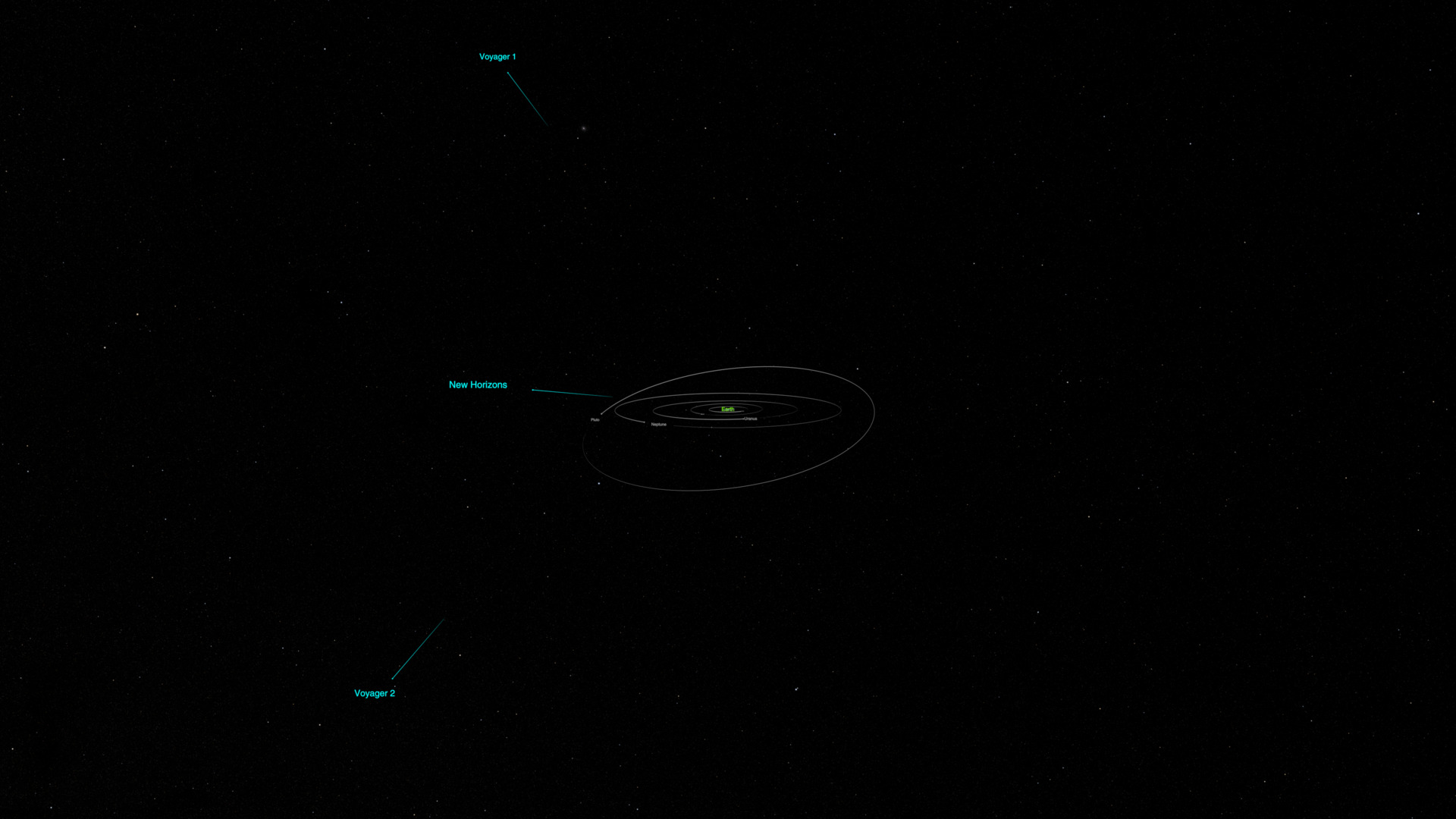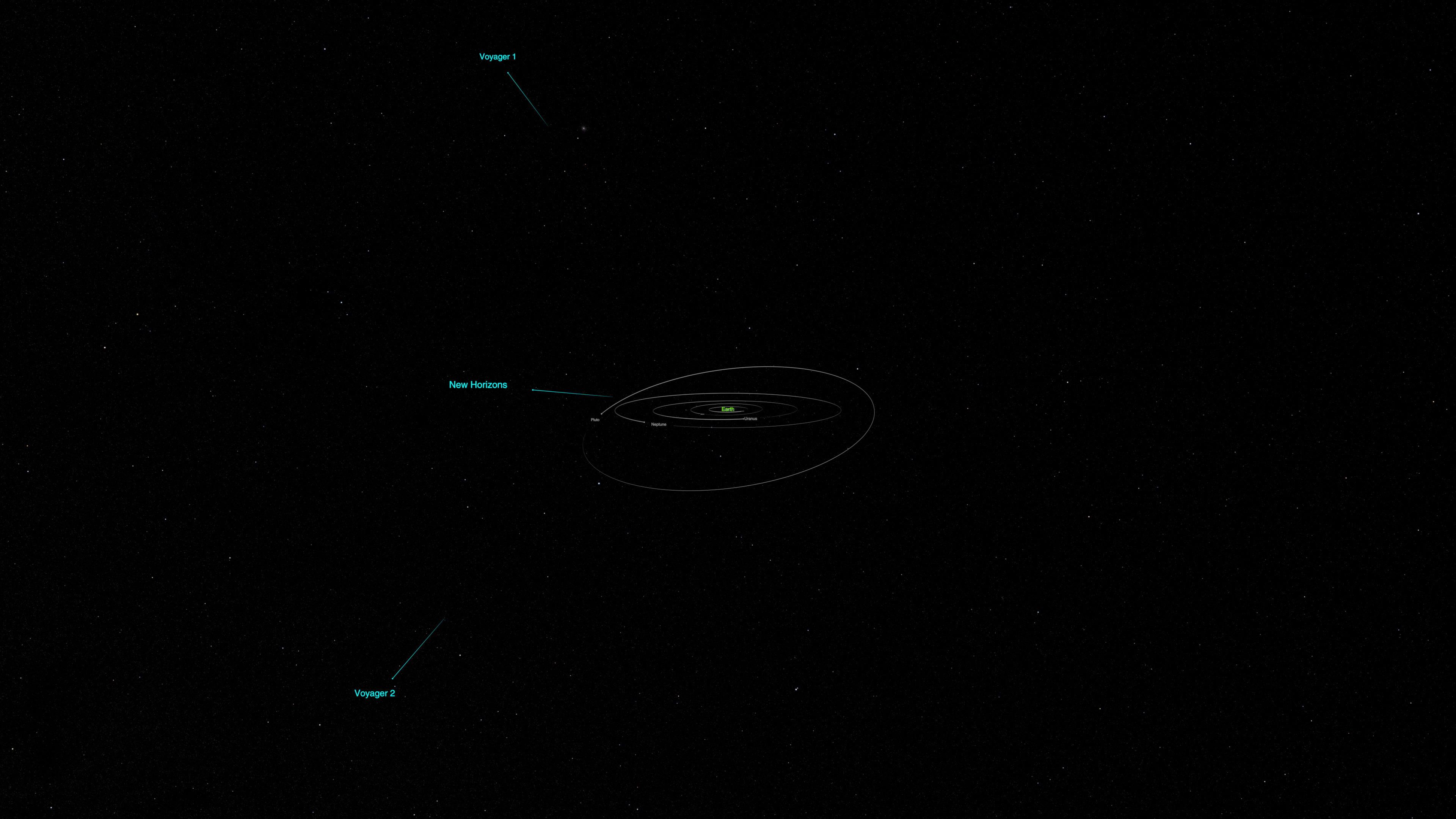 Still image – Distant view of the Solar System. The planets (and Pluto) are visible at the center. Spreading outward are NASA’s most distant spacecraft: Voyager 1, Voyager 2, and New Horizons.